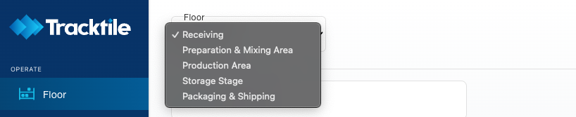 Upon logging into Tracktile, navigate to the Floor page. Here, you'll find predefined stages and containers optimized for your operations. Below are the stages and their corresponding containers sat up for pastry manufactory by our team: