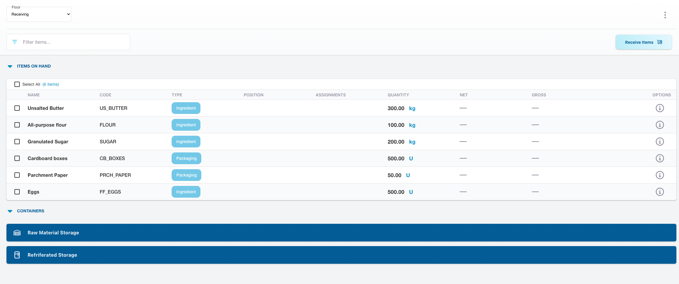 Now you can receive items from suppliers and store them in the appropriate places, setting the stage for efficient and effective pastry manufacturing.