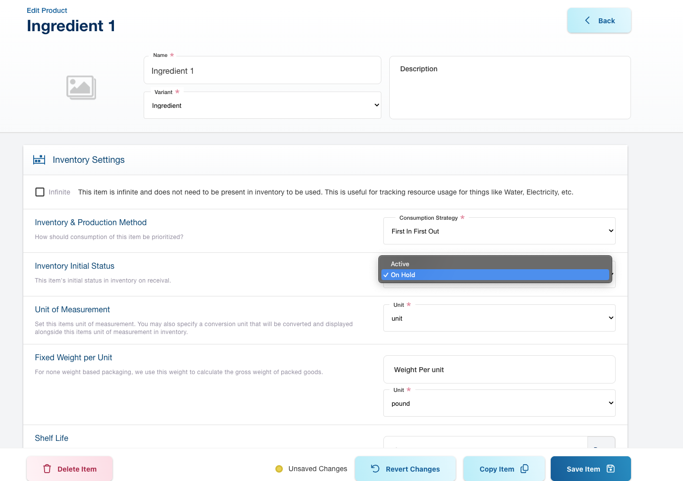 Configure Initial Status: In the Inventory Settings section, find the Inventory Initial Status Configuration. Choose from the dropdown options—either "Active" or "On Hold." By default, items are set to "Active."