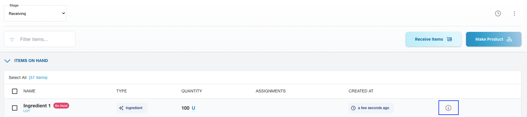 When items are received from a supplier, whether through a Purchase Order or other means, items set as "On Hold" will display a red "On Hold" warning label. Learn more about receiving items from a supplier here.