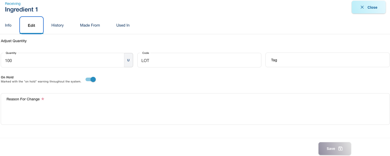 To reactivate the 'On Hold' status for any item, follow the same steps but activate the toggle instead. Items with 'On Hold' status will be marked throughout the system, alerting you that they are pending further checks or clearance but are still available for use if necessary.