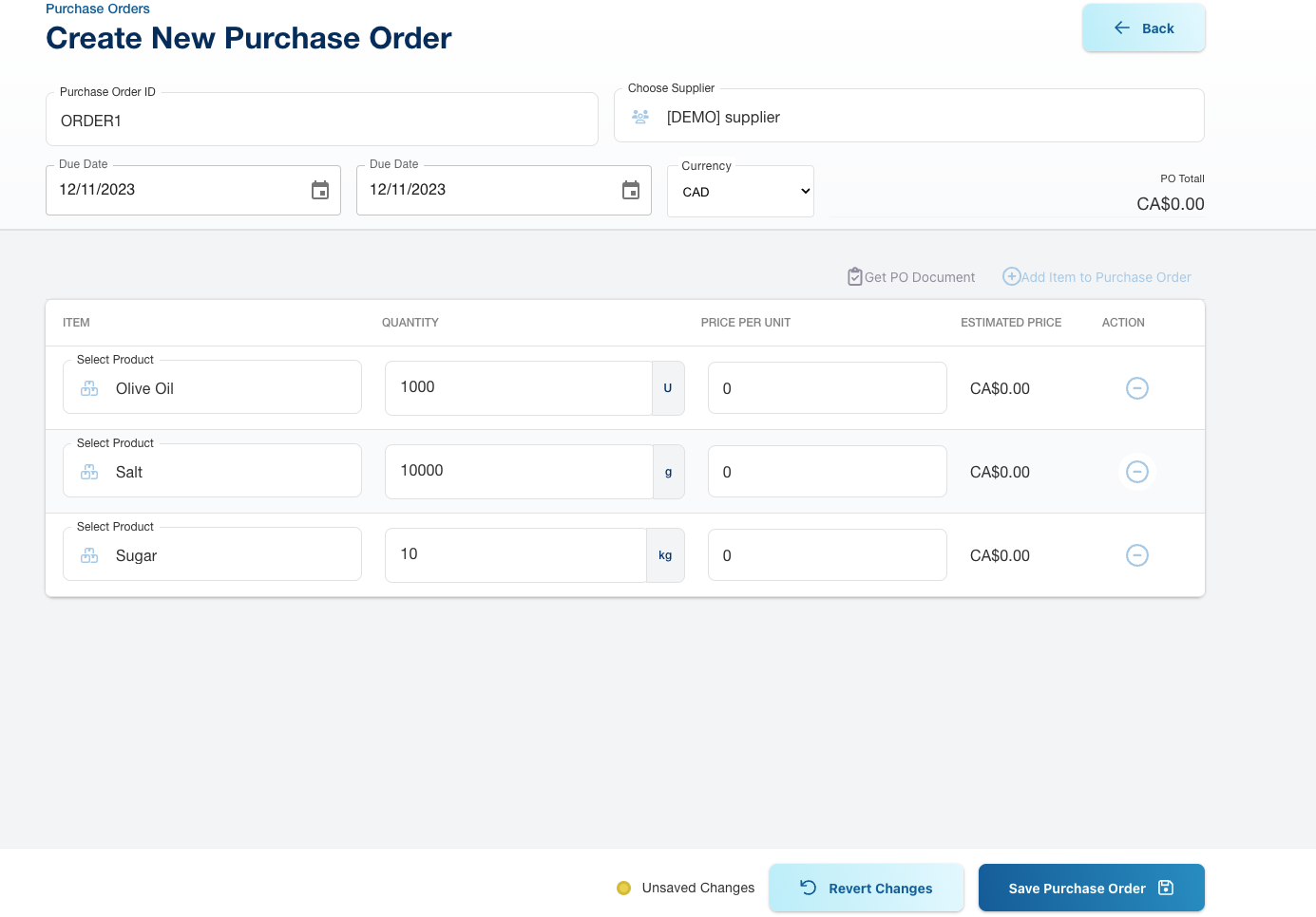 - When creating a new purchase order and selecting this supplier, the system will automatically include the default order, which can be adjusted as needed
