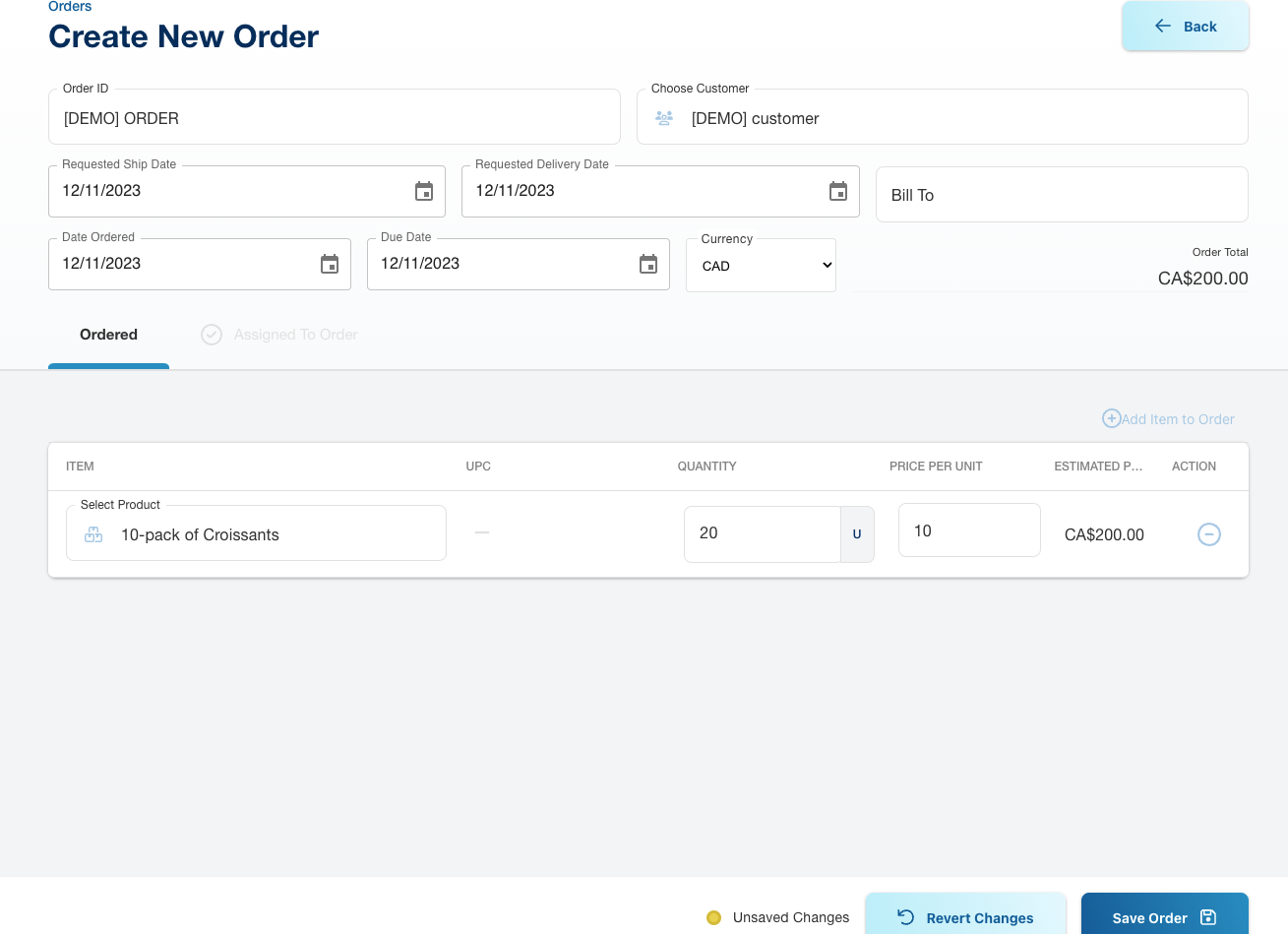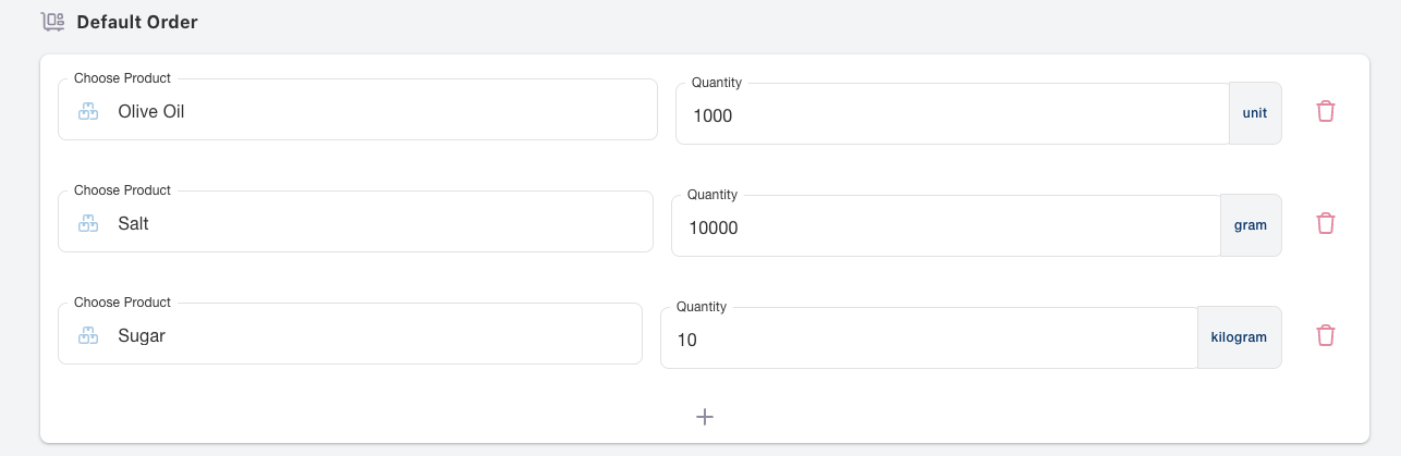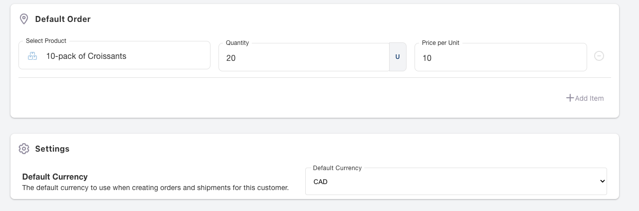 Default Ordersection:Add items to the default order. For example, set 20 units of 10-pack croissants as a default item for a customer