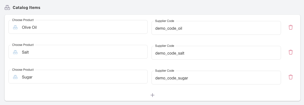 Catalog ItemsandDefault Order:- Assign specific catalog items to the supplier. For instance, tie Olive Oil, Salt, and Sugar to a supplier