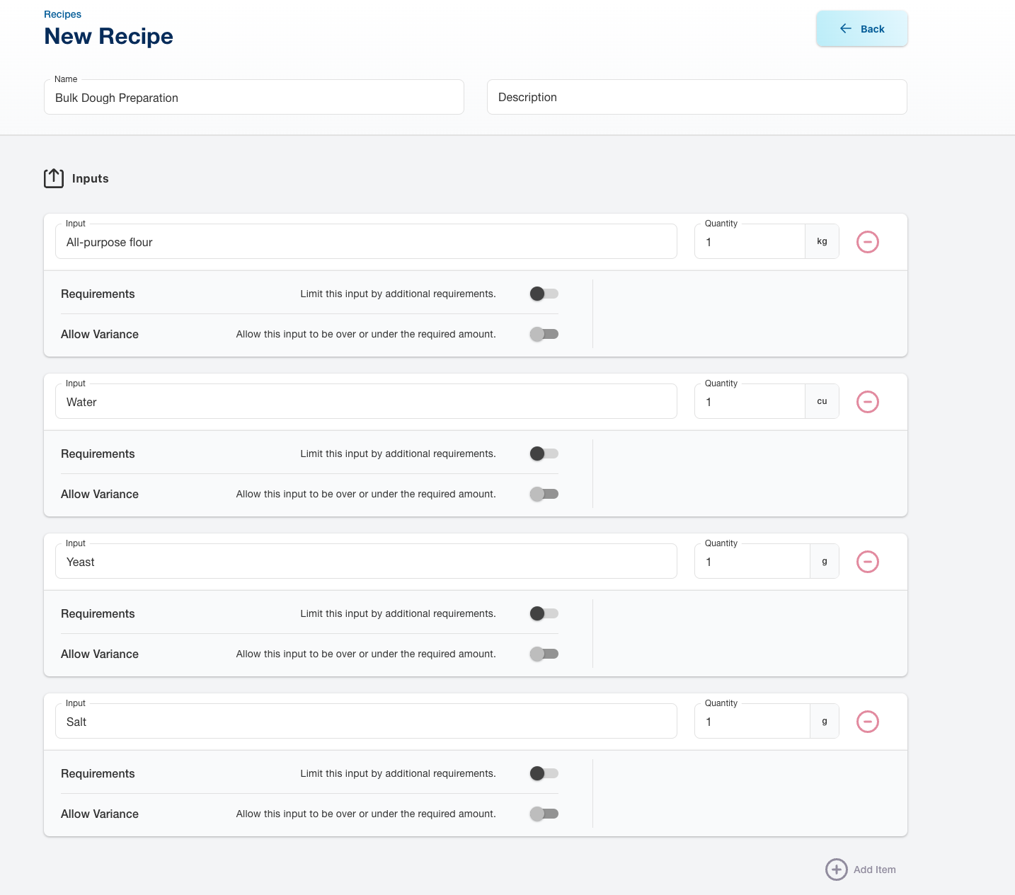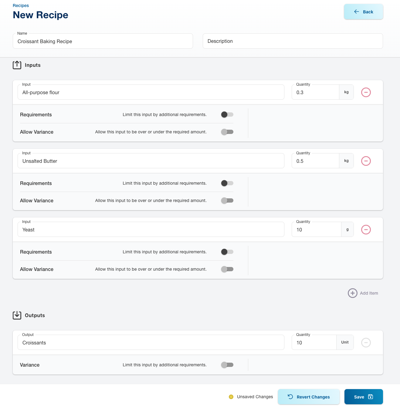 - Inputs: Add flour, butter, yeast, and other essential ingredients.
