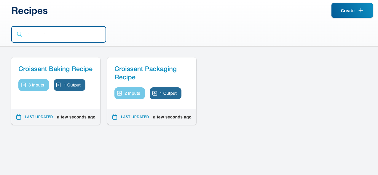 Upon logging into Tracktile, navigate to the Recipes page, where you can see all your existing recipes. To create a new recipe, simply click the "Create" button.