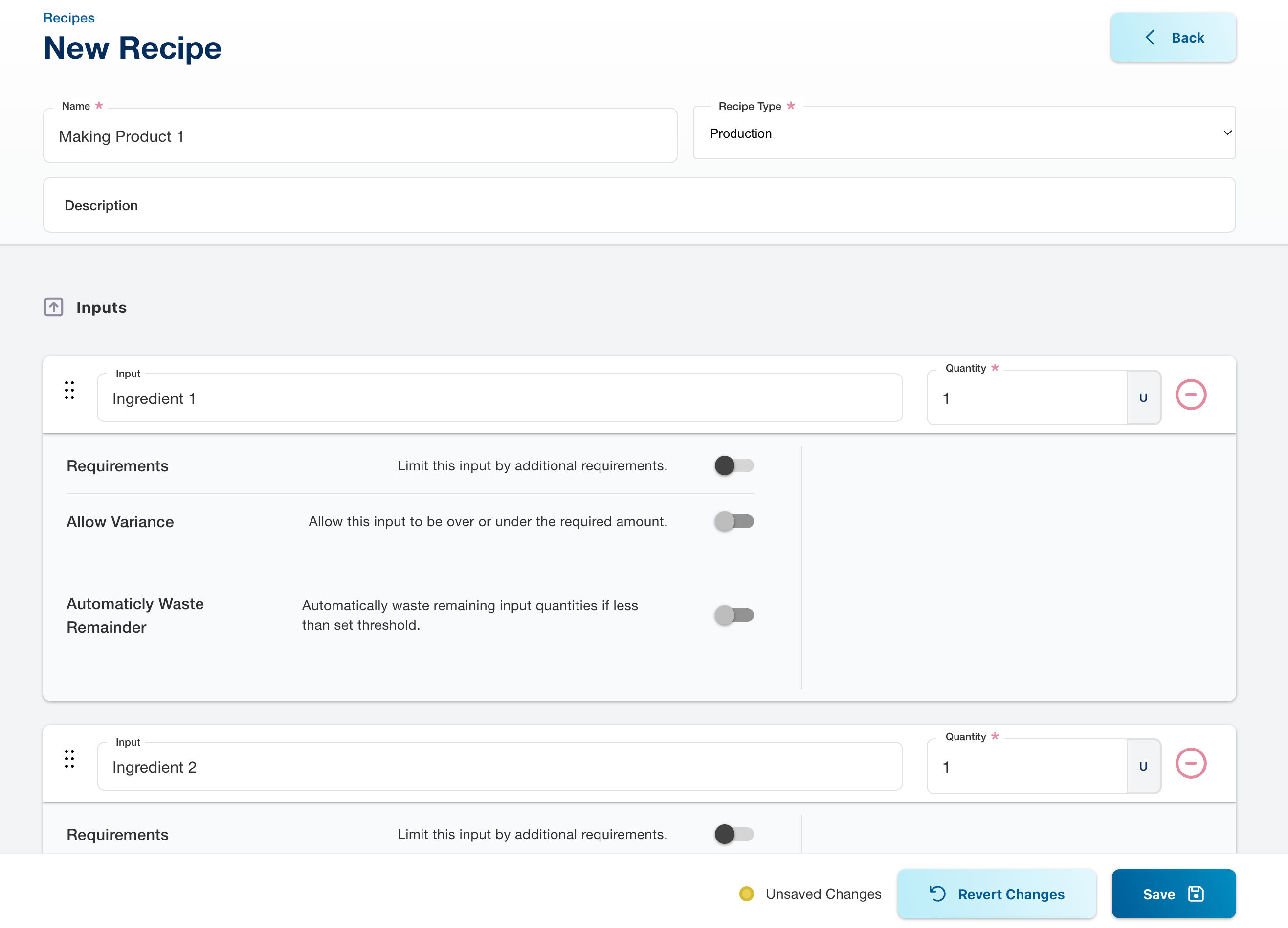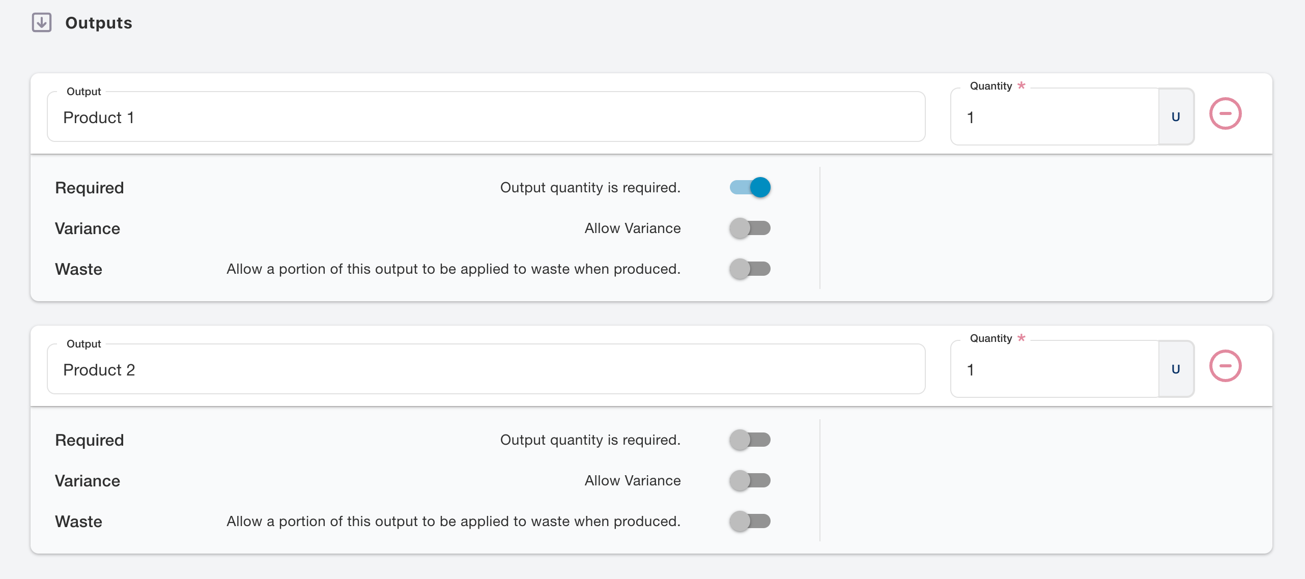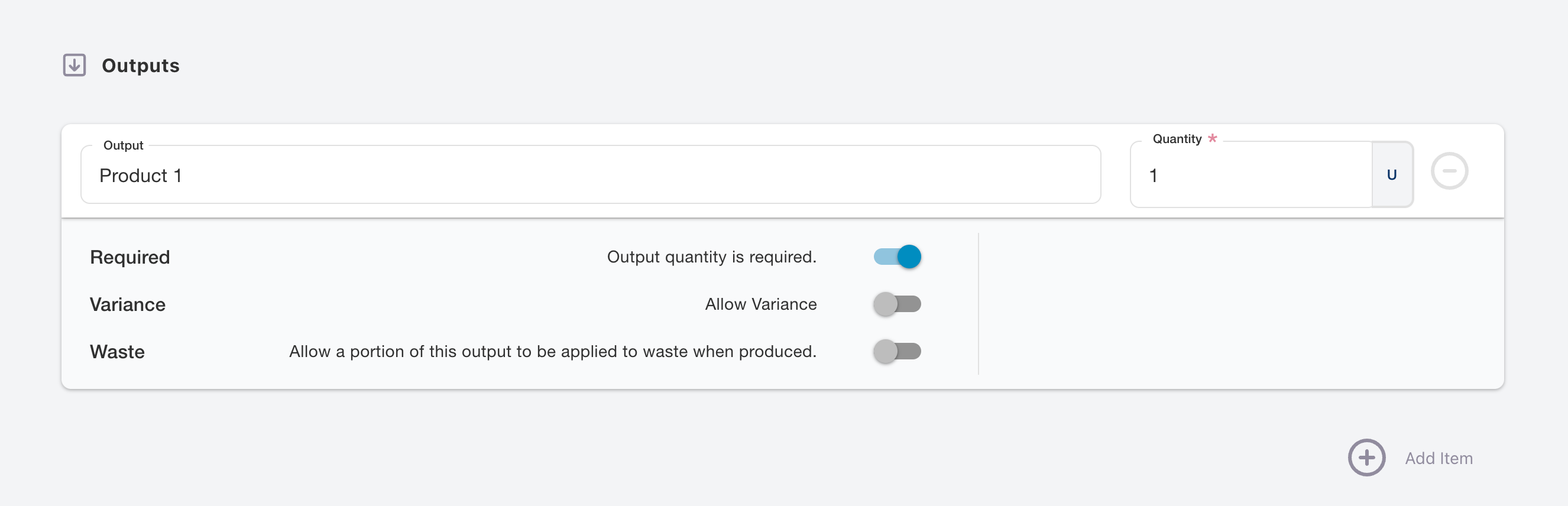 Set Outputs as Optional: Deactivate the toggle to make an output optional. This adjustment allows for flexibility depending on the actual production outcomes.