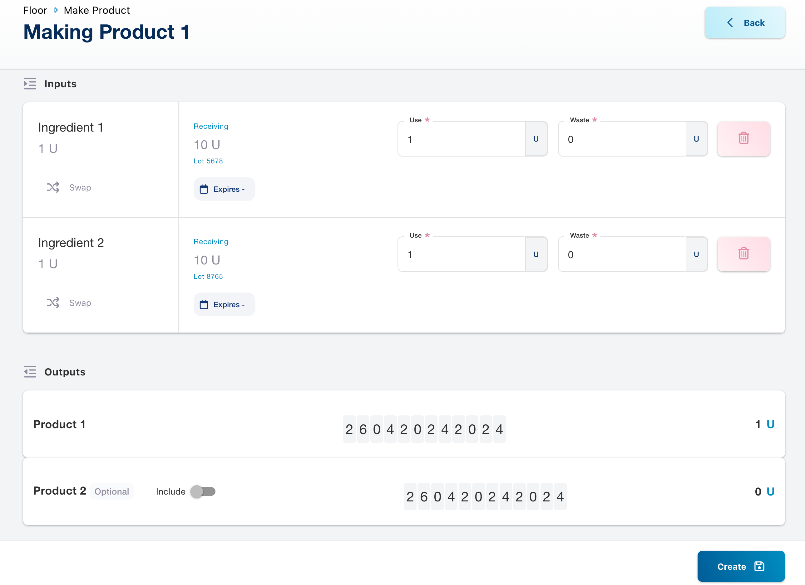 Production Stage: When the recipe is used in production (navigate to Floor stage > Make Product), outputs set as optional will be clearly marked with an "optional" label.