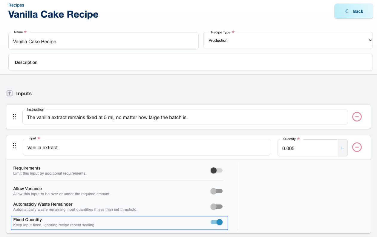 - Enable Fixed Quantity: Activate this setting for the input/output that needs to be fixed. This ensures that the quantity of this particular input or output remains constant, regardless of the number of recipe repeats or scaling adjustments.