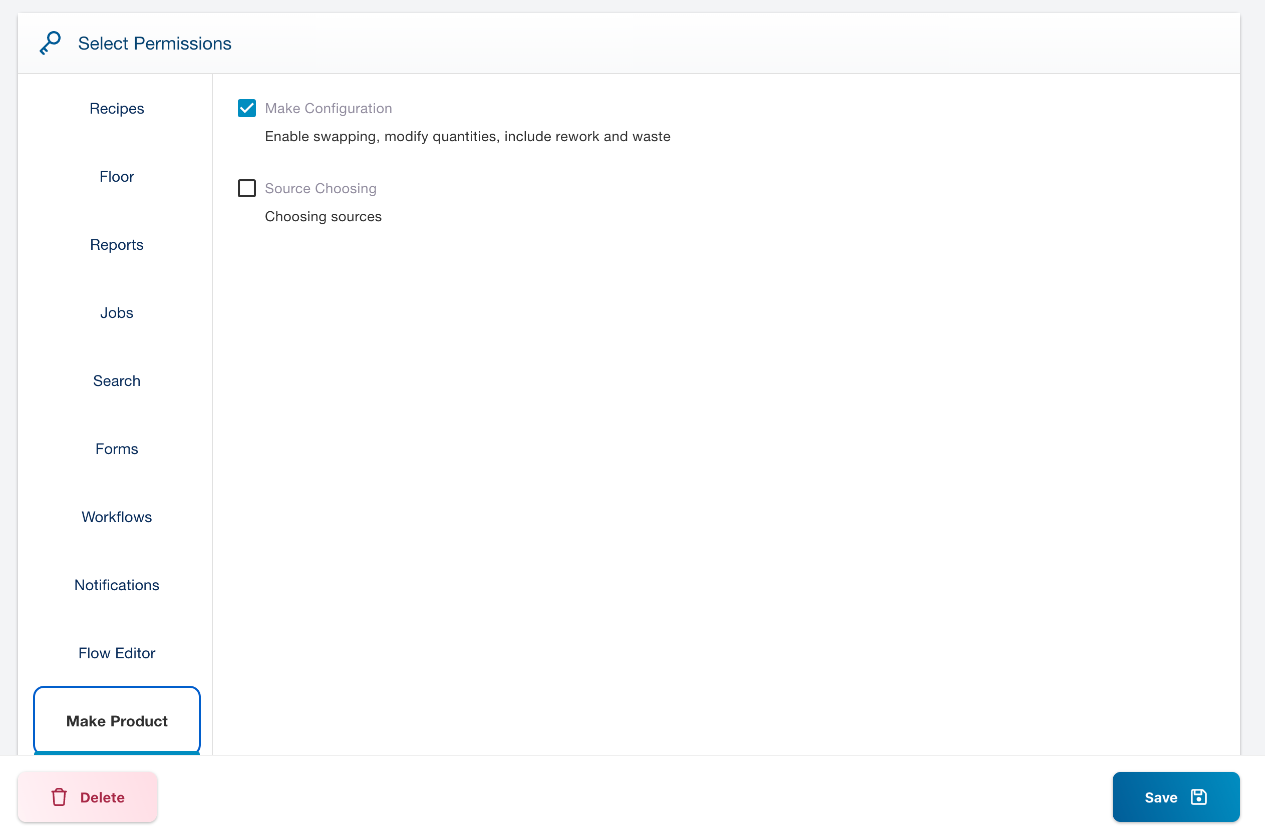 Workers without 'Make product configuration' permission cannot modify the recipe execution settings, such as swapping ingredients, adding rework, or tracking waste.