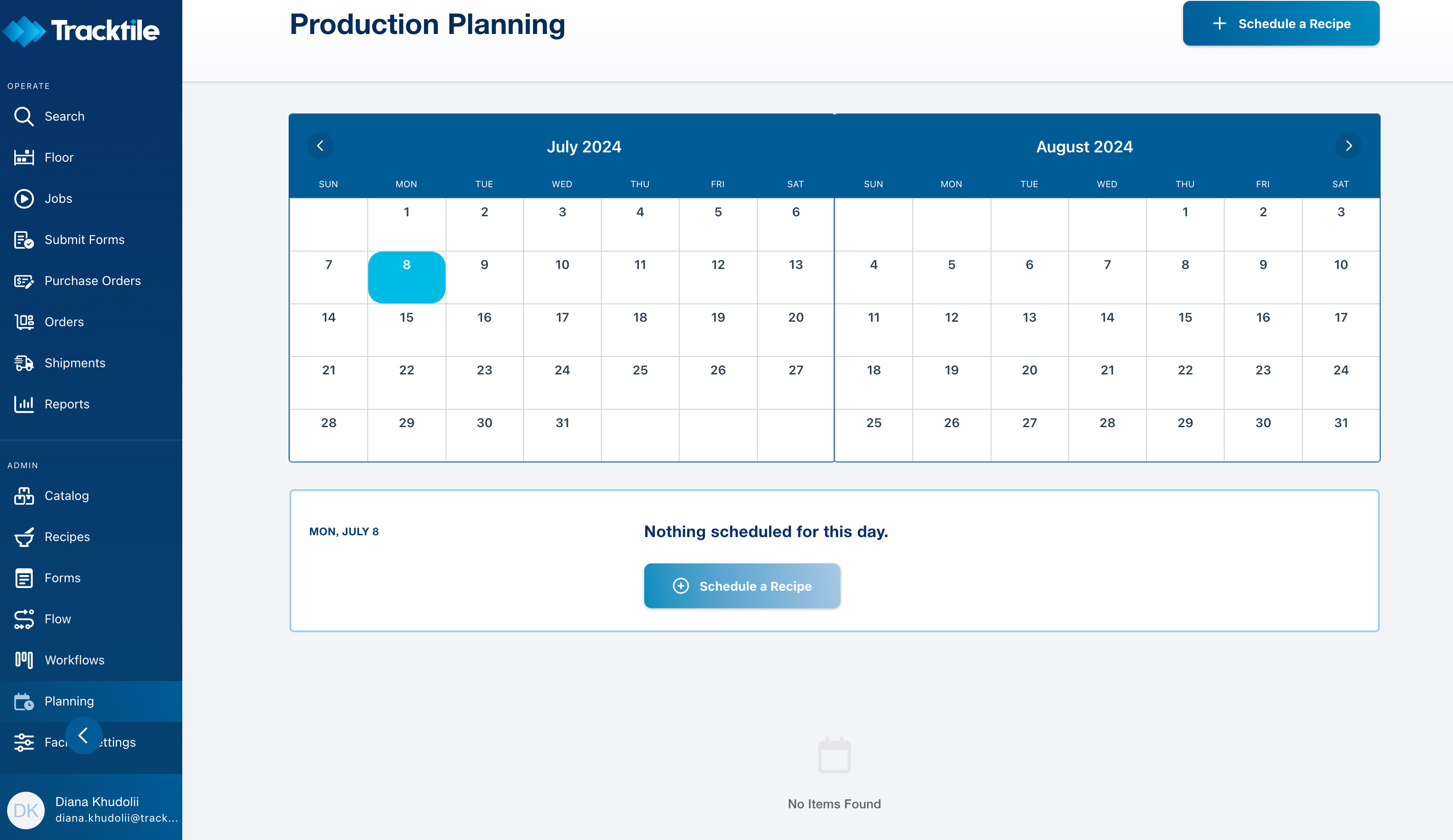 Schedule a Recipe: Click on āSchedule a recipeā. Select your desired recipe from the options availableāpreparation, production, or packaging.
