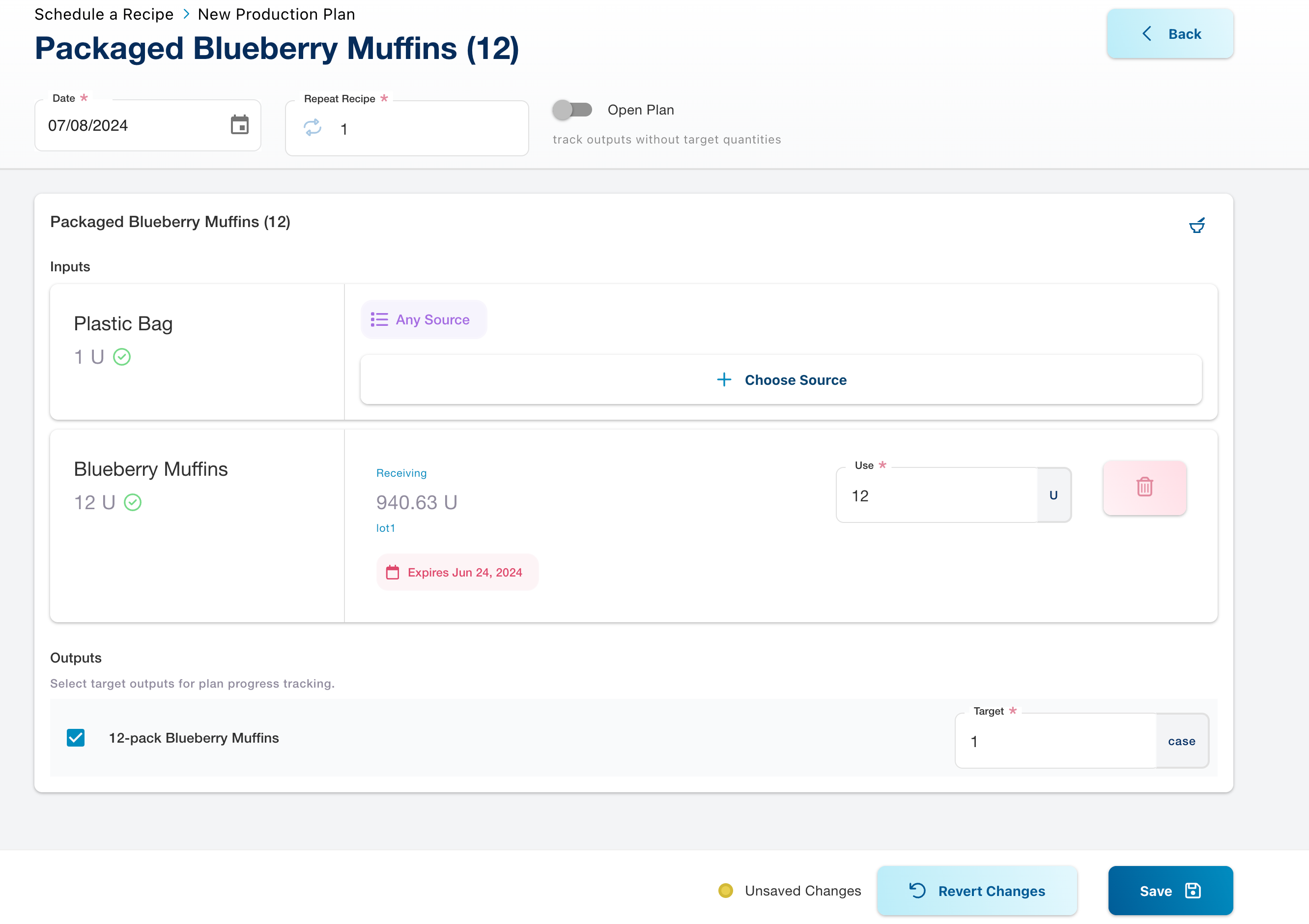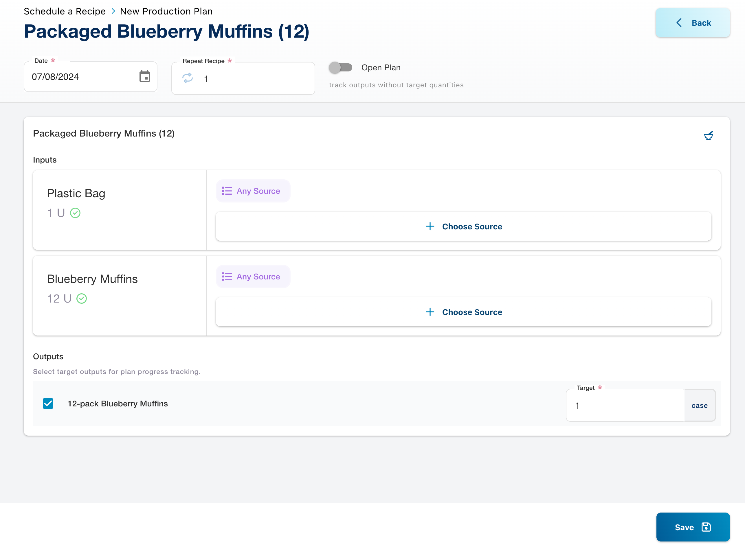 To pre-plan specific sources, click āchoose sourceā next to the input and select the exact inventory code to be used. This ensures that specific batches or qualities of materials are used as required.