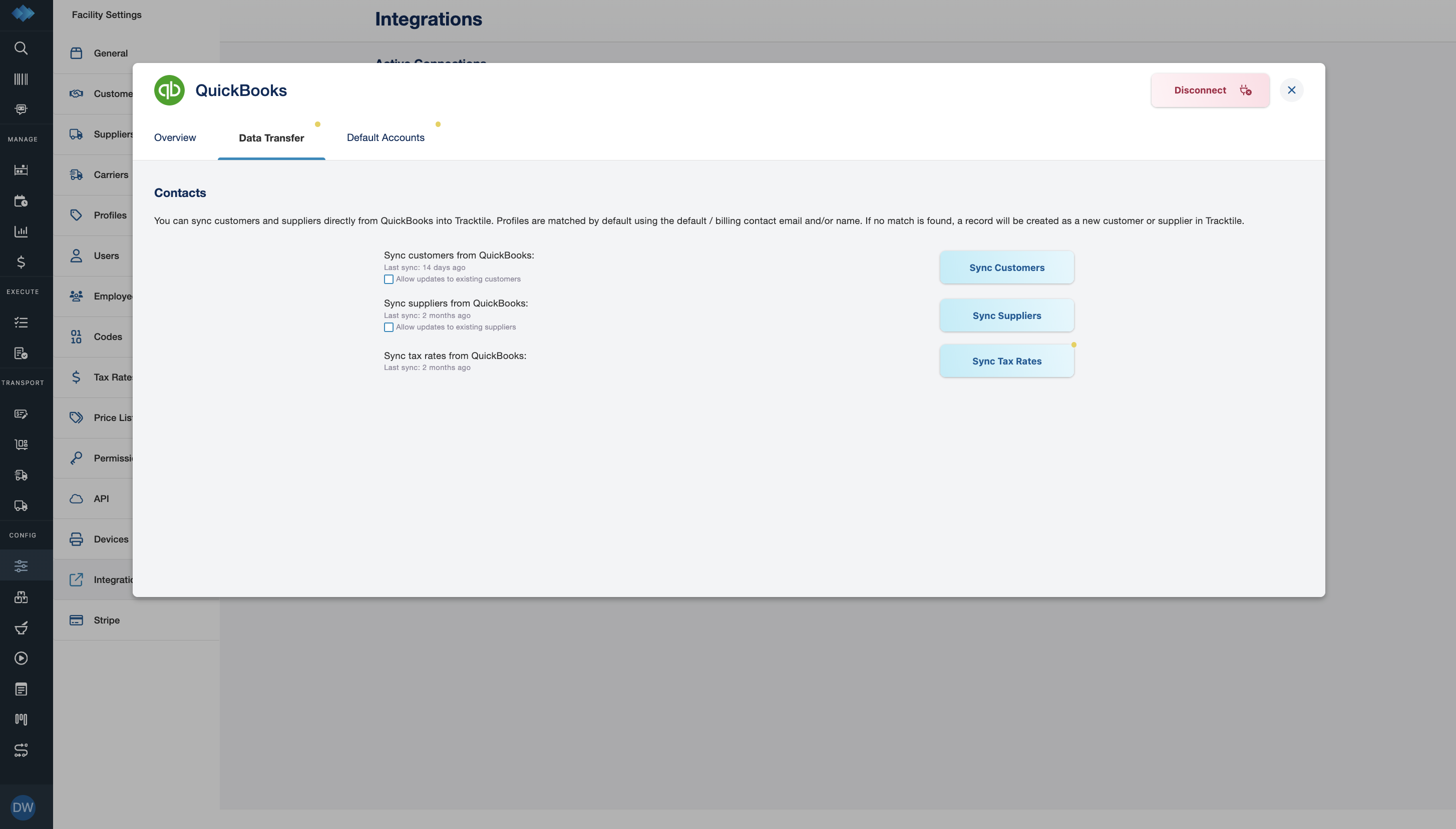 - Go to Integrations β QuickBooks β Data Transfer