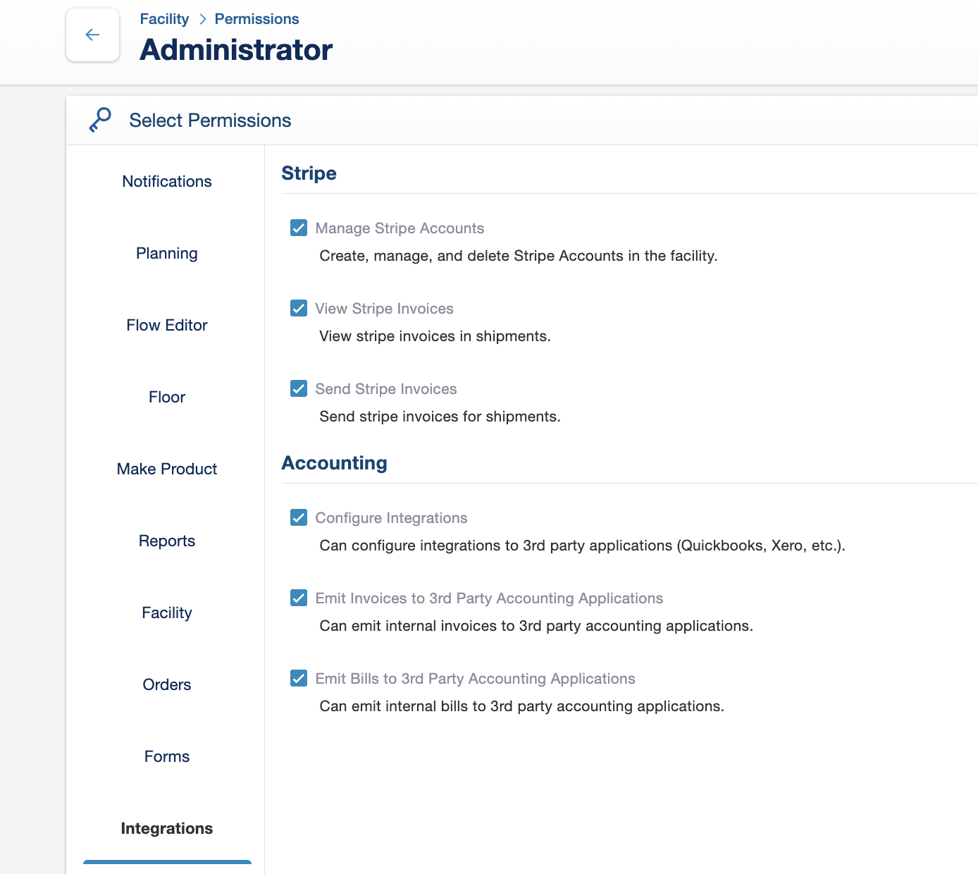 Navigate to Facility Settings β Permissions β Integrations to manage these settings.