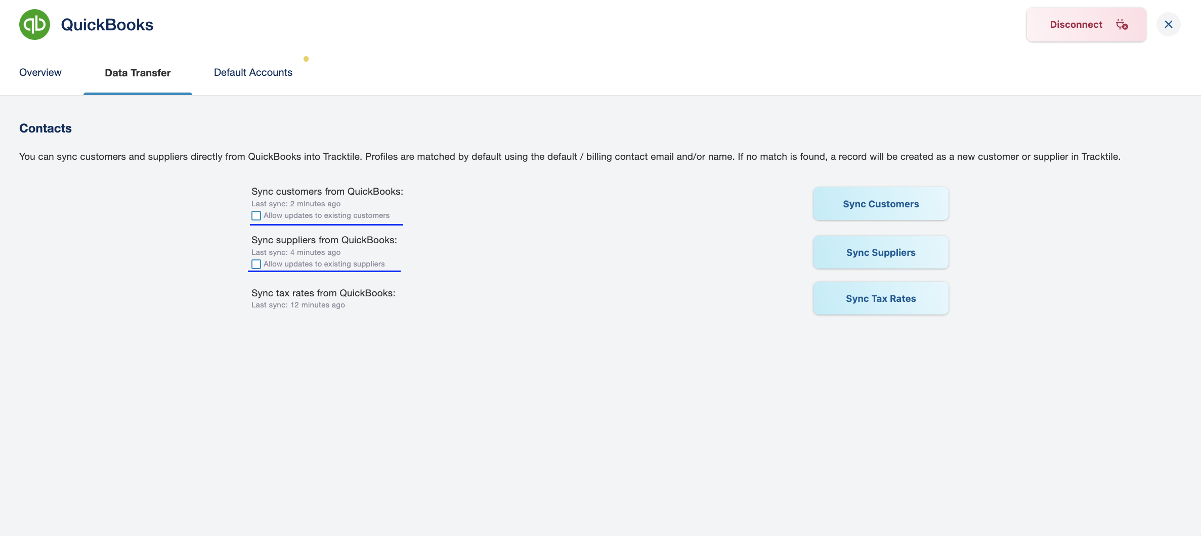 Keep your contact records in sync between Tracktile and QuickBooks. The sync process intelligently matches existing records to avoid duplicates.