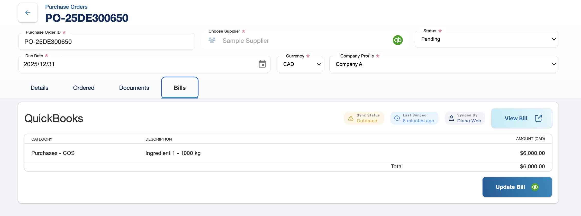 - Click Update Bill to push the changes to QuickBooks