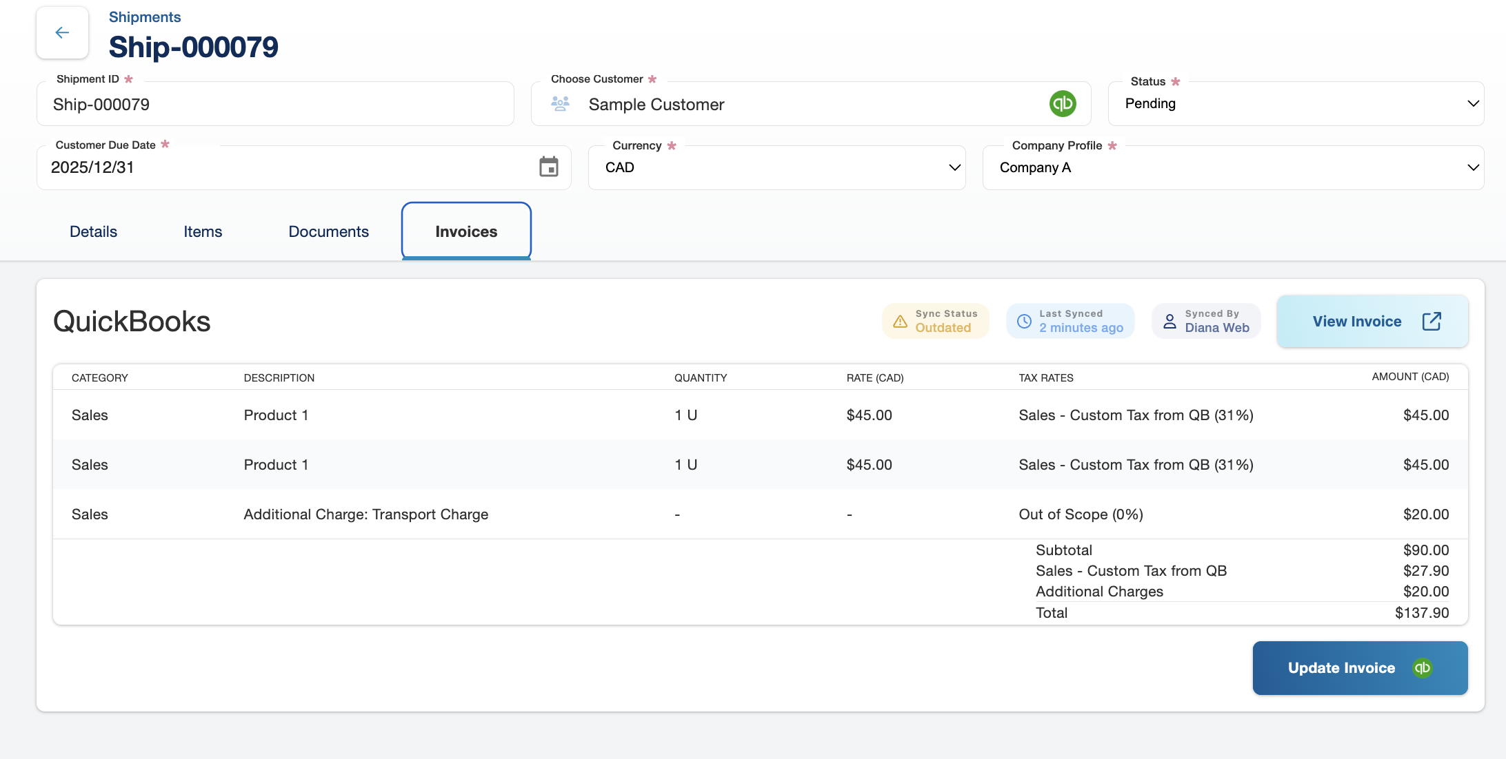 - Click Update Invoice to push the changes to QuickBooks