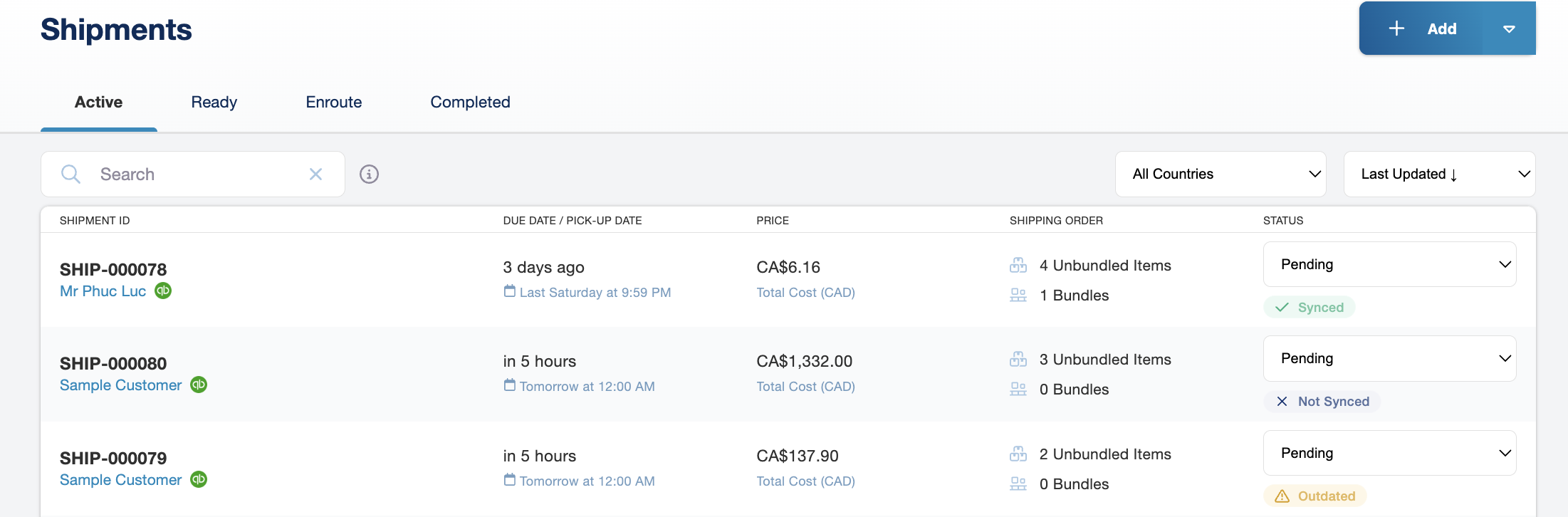 - Shipment displays "Synced" status badge