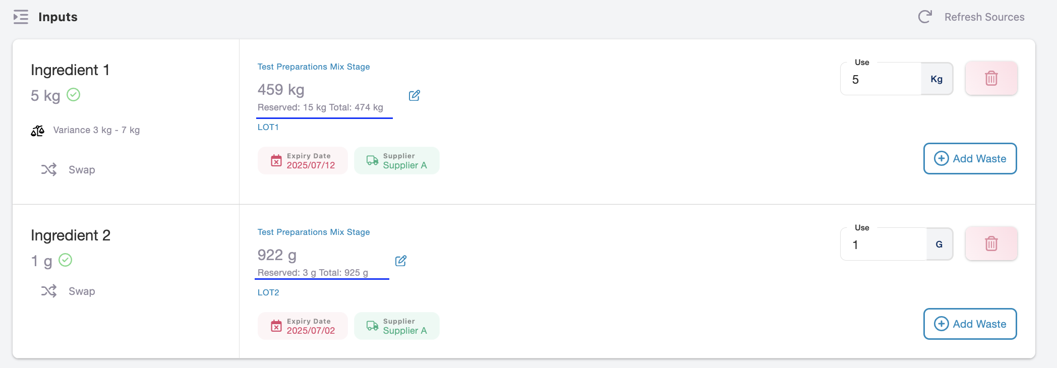 Reservations account for both Use and Waste quantities. If Draft 1 has Use = 20 kg and Waste = 5 kg, the total reservation is 25 kg.