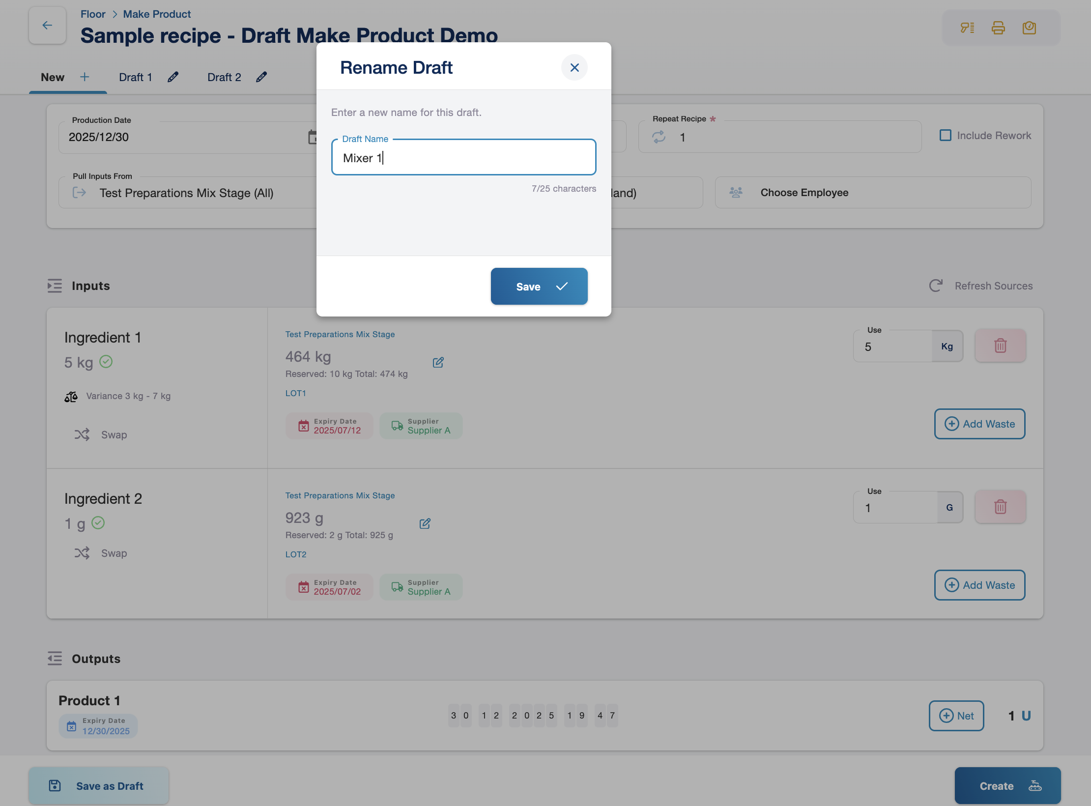 Plan parallel production: Create separate drafts for each mixer or production line, named appropriately (Mixer 1, Mixer 2, etc.) to keep track of which is which.