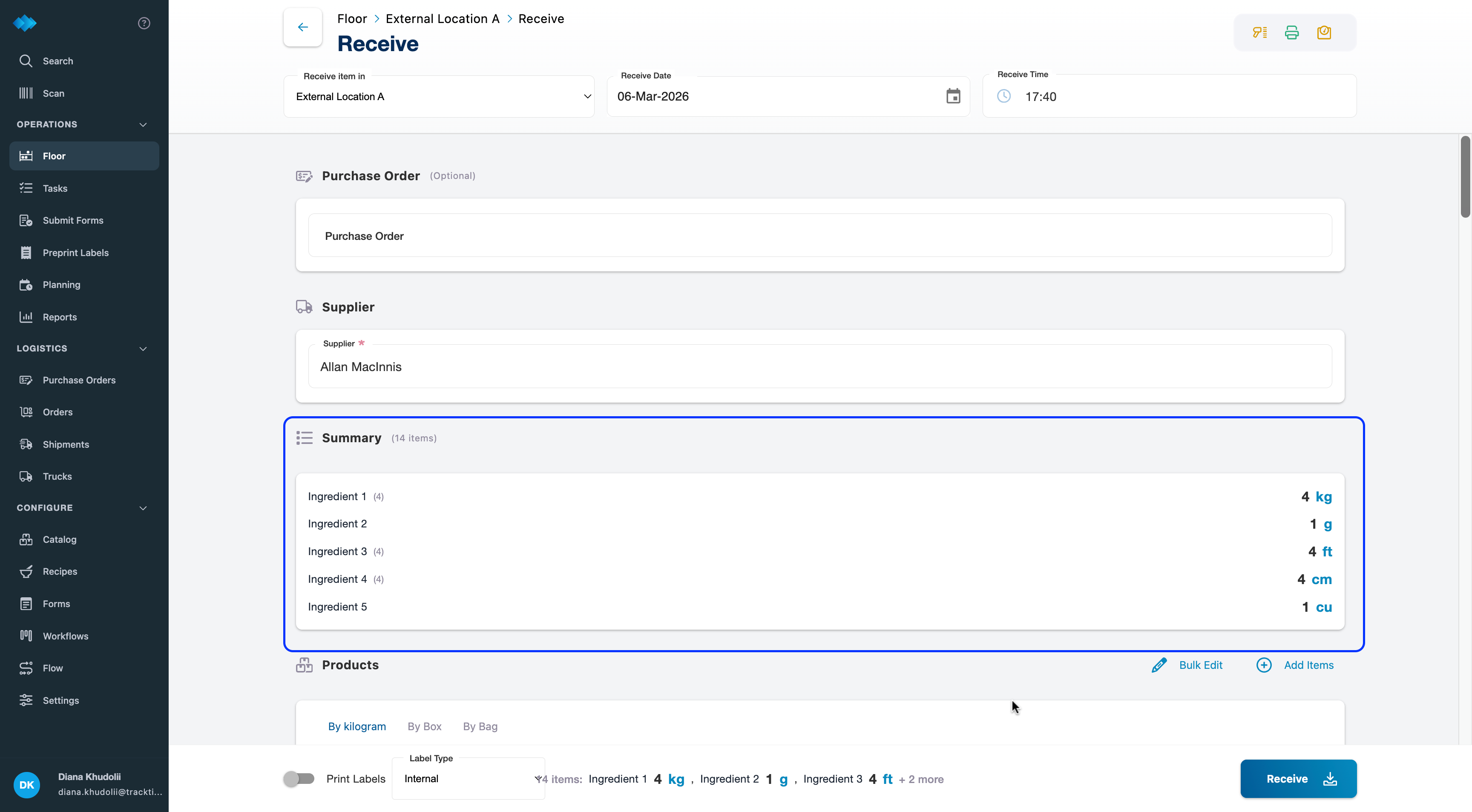 The receiving form now includes a live Summary section showing the total quantity per item as you add them.